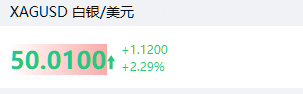 现货白银快速拉升涨超2%,报50.01美元/盎司,首次上触50美元整数大关。