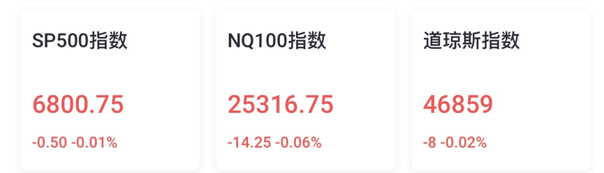 10月9日(周四),美股三大股指期货在盘前时段持续震荡。纳指100指数期货跌0.06%,报25316.75点,标普500指数期货跌0.01%,报6800.75点,道琼斯指数期货跌0.02%,报46859点。