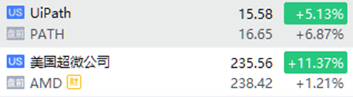 AMD续涨超1%、UiPath涨近7%,此前分别宣布与OpenAI签订合作协议;