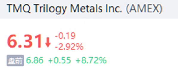 矿产勘探公司Trilogy Metals涨超8%,美国政府将收购公司10%股份;