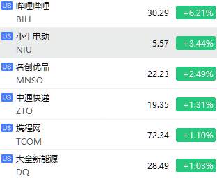 热门中概股多数上涨,哔哩哔哩涨超6%,小牛电动涨超3%,名创优品涨超2%,中通快递、携程网、大全新能源涨超1%。