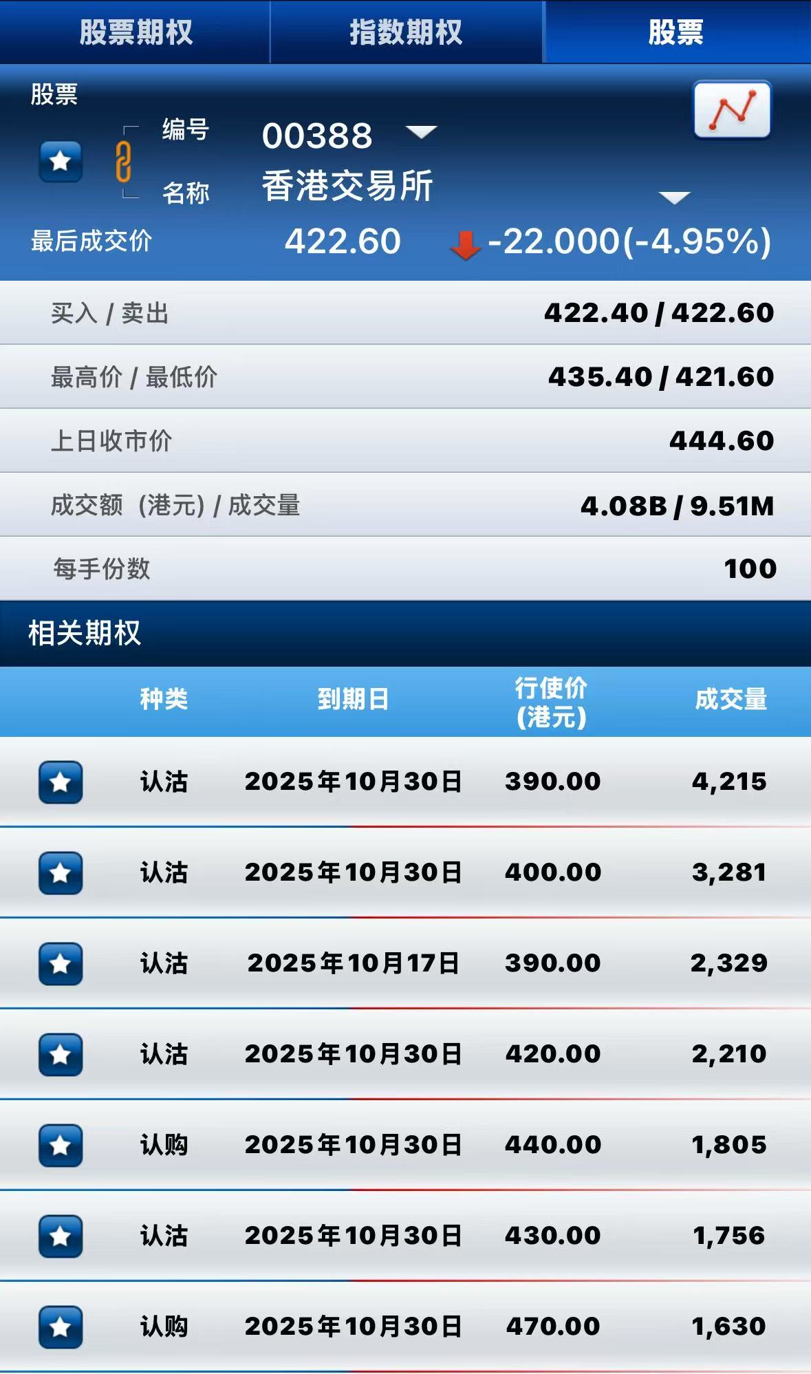 香港交易所跌近5%,期权方面:半日成交超4.5万张合约,其中于10月30日到期行权价390港元的认沽期权成交量居前,成交近超4200张合约。 $HEX.HK 20251030 390.00 PUT$