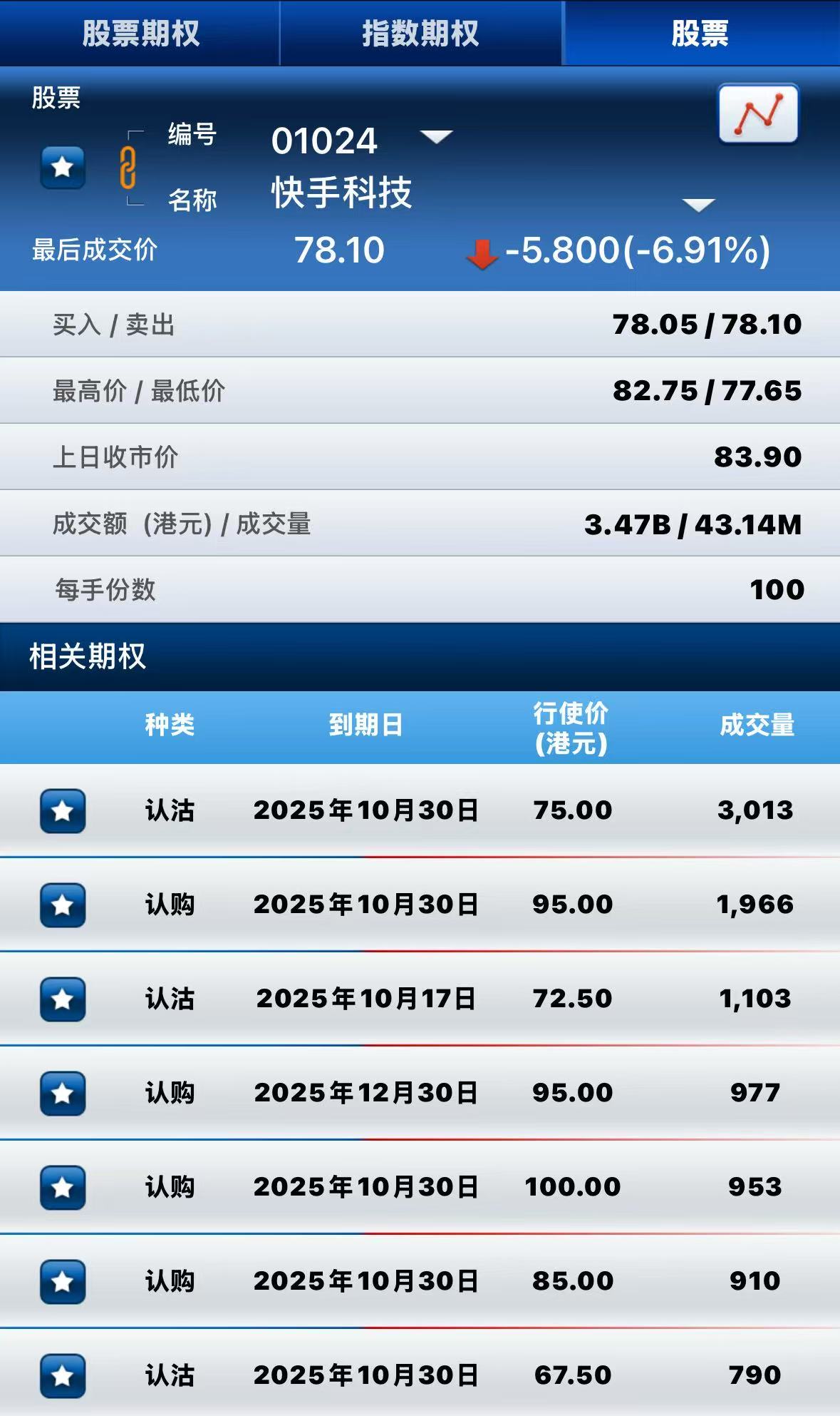 快手-W跌近7%,期权方面:半日成交超2.7万张合约,其中于10月30日到期行权价75港元的认沽期权成交量居前,成交近超3000张合约。 $KST.HK 20251030 75.00 PUT$
