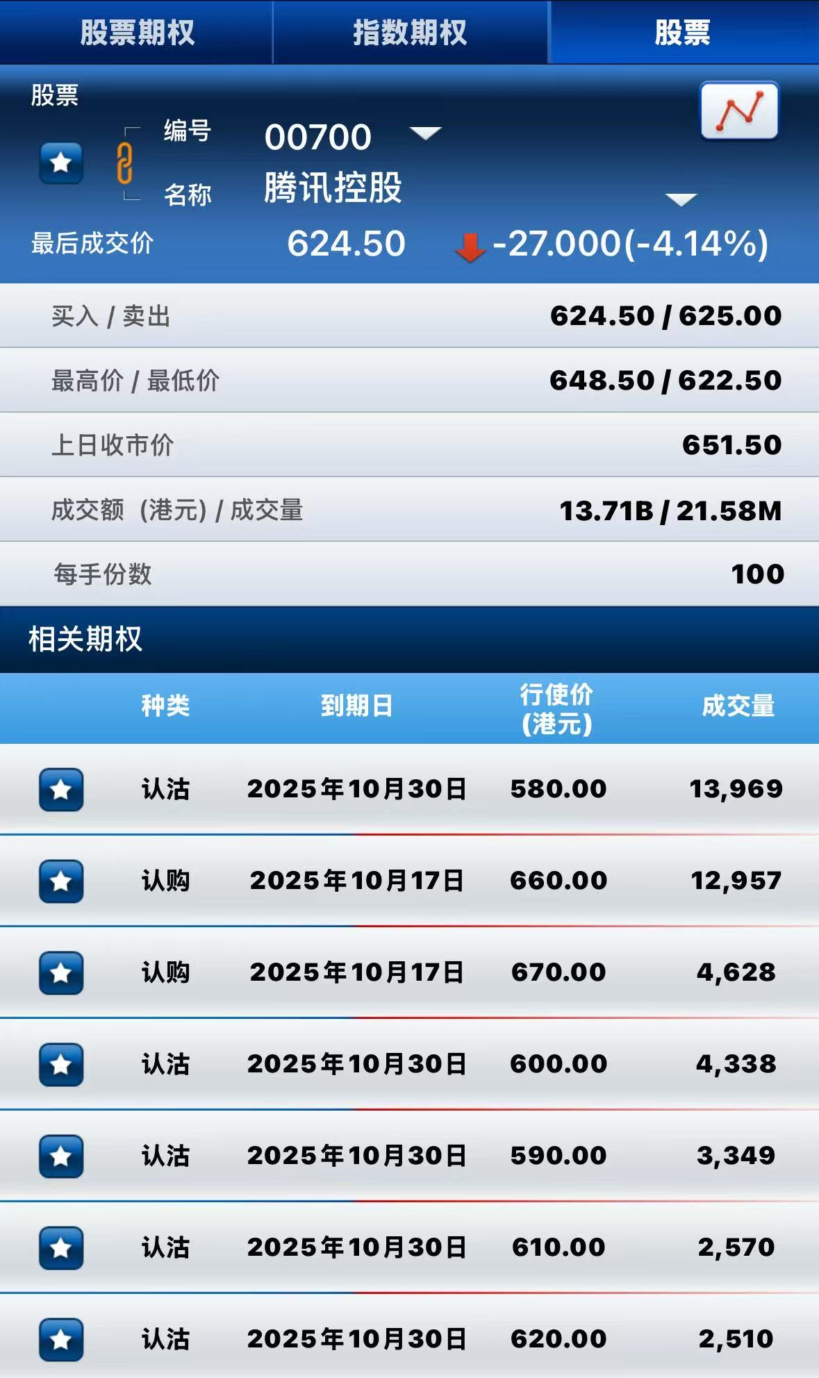 腾讯控股跌超4%,期权方面:半日成交超12.2万张合约,其中于10月30日到期行权价580港元的认沽期权成交量居前,成交近14000张合约。 $TCH.HK 20251030 580.00 PUT$
