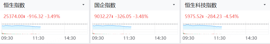 10月13日,港股三大指数齐跌,截止午间收盘,恒生指数跌3.49%,恒生科技指数跌4.54%,国企指数跌3.48%。