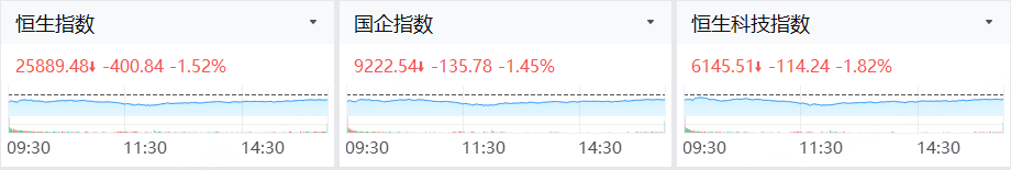 恒生指数收跌1.52%,盘中曾一度跌至3.6%,国企指数、恒生科技指数分别下跌1.45%及1.82%,恒科指曾大跌近5%。