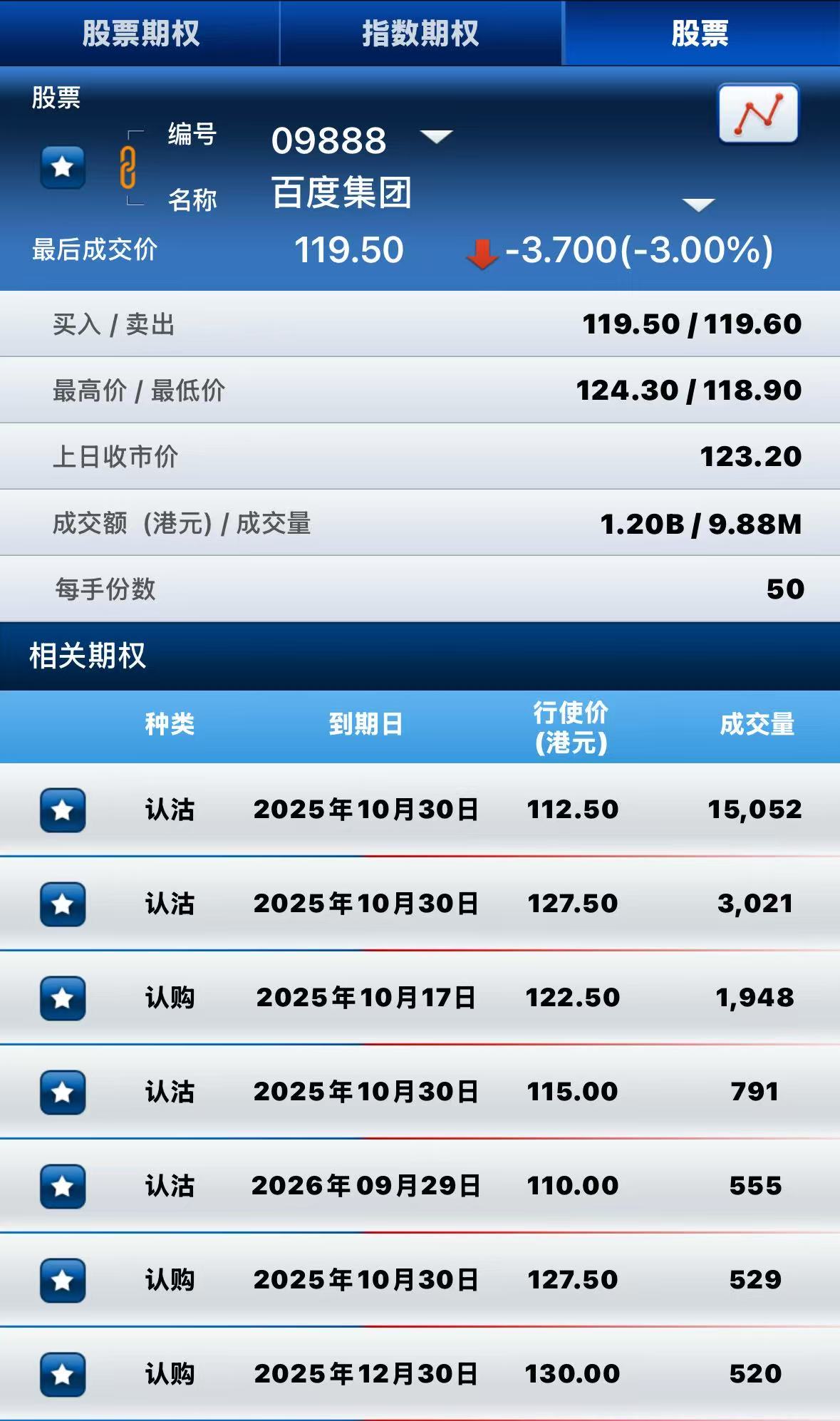 百度集团-SW下跌3%,期权方面:半日成交超3.5万张合约,其中于10月30日到期行权价112.5港元的认沽期权成交量居前,成交超15000张合约。 $BIU.HK 20251017 112.50 PUT$
