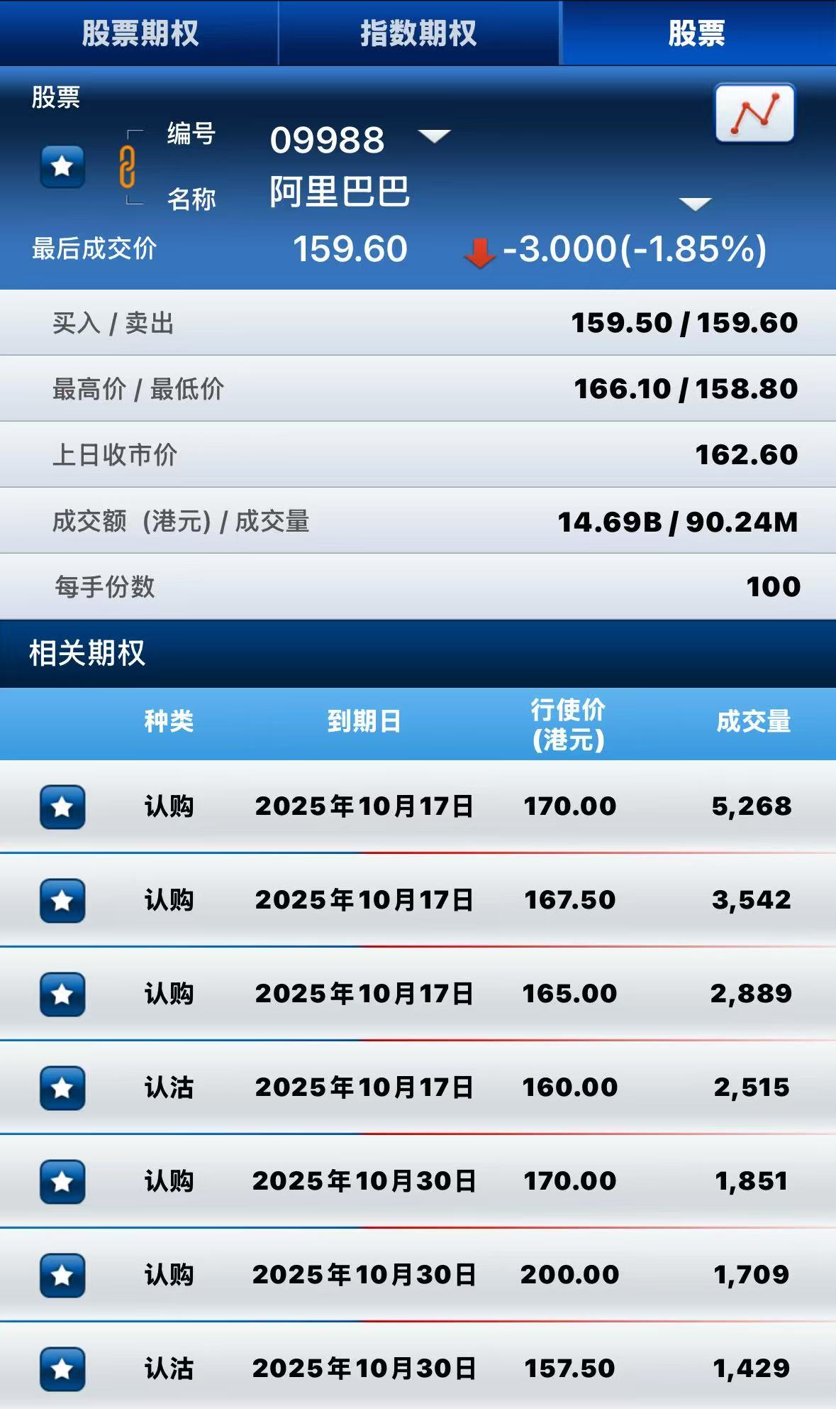阿里巴巴-W跌近2%,期权方面:半日成交超6.8万张合约,其中于10月17日到期行权价170港元的认购期权成交量居前,成交超5200张合约。 $ALB.HK 20251017 170.00 CALL$
