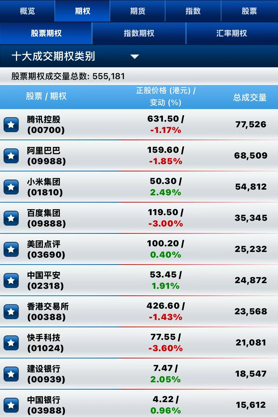 截止午间收盘,港股期权半日成交超55万张。其中, 腾讯控股成交量居前,期权成交超7.7万张;阿里巴巴-W名列次席,期权成交超6.8万张;小米集团-W位居第三,期权成交近5.5万张。