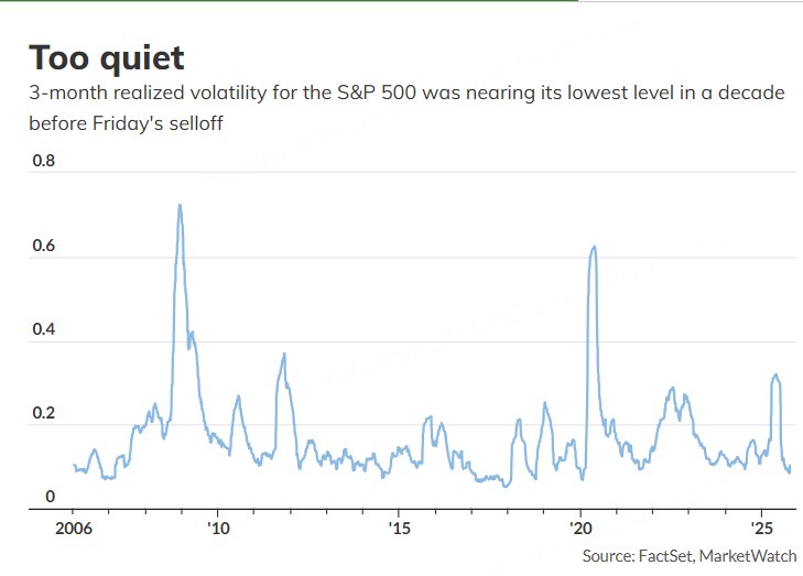 整个夏天,美股一路缓步上扬,几乎没有受到太多干扰。根据 FactSet 和 MarketWatch 的计算,截至上周,标普 500 的三个月实现波动率(realized volatility)降至 2020 年 1 月以来最低水平。
