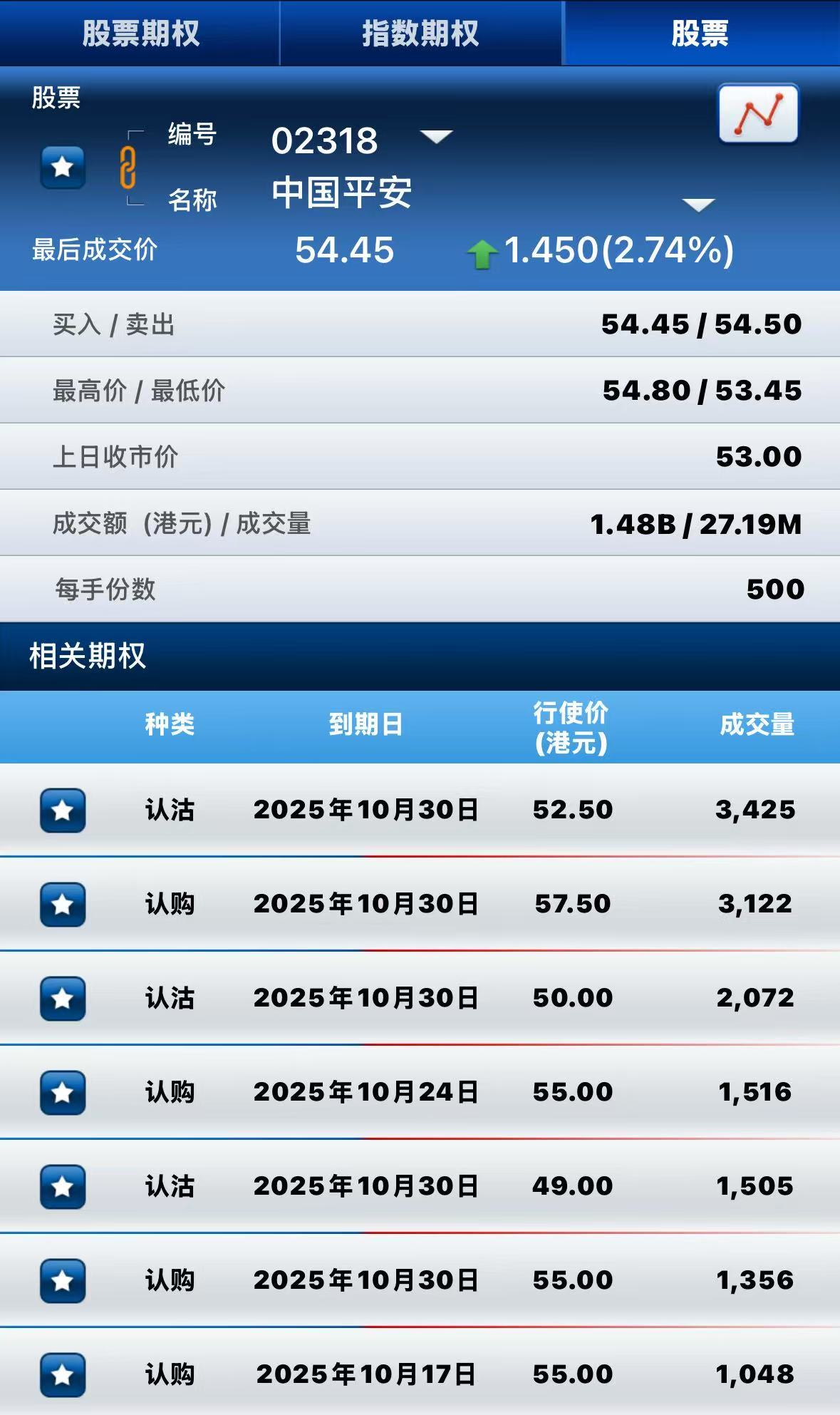 中国平安涨近3%,期权方面:半日成交超2.8万张合约,其中于10月30日到期行权价52.50港元的认沽期权成交量居前,成交超3400张合约。 $PAI.HK 20251030 52.50 PUT$