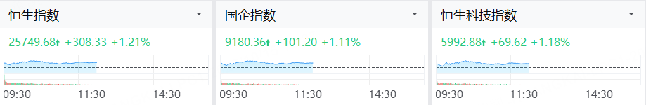 10月15日,港股三大指数全线反弹,截止午间收盘,恒生指数涨1.21%,恒生科技指数涨1.18%,国企指数涨1.11%。