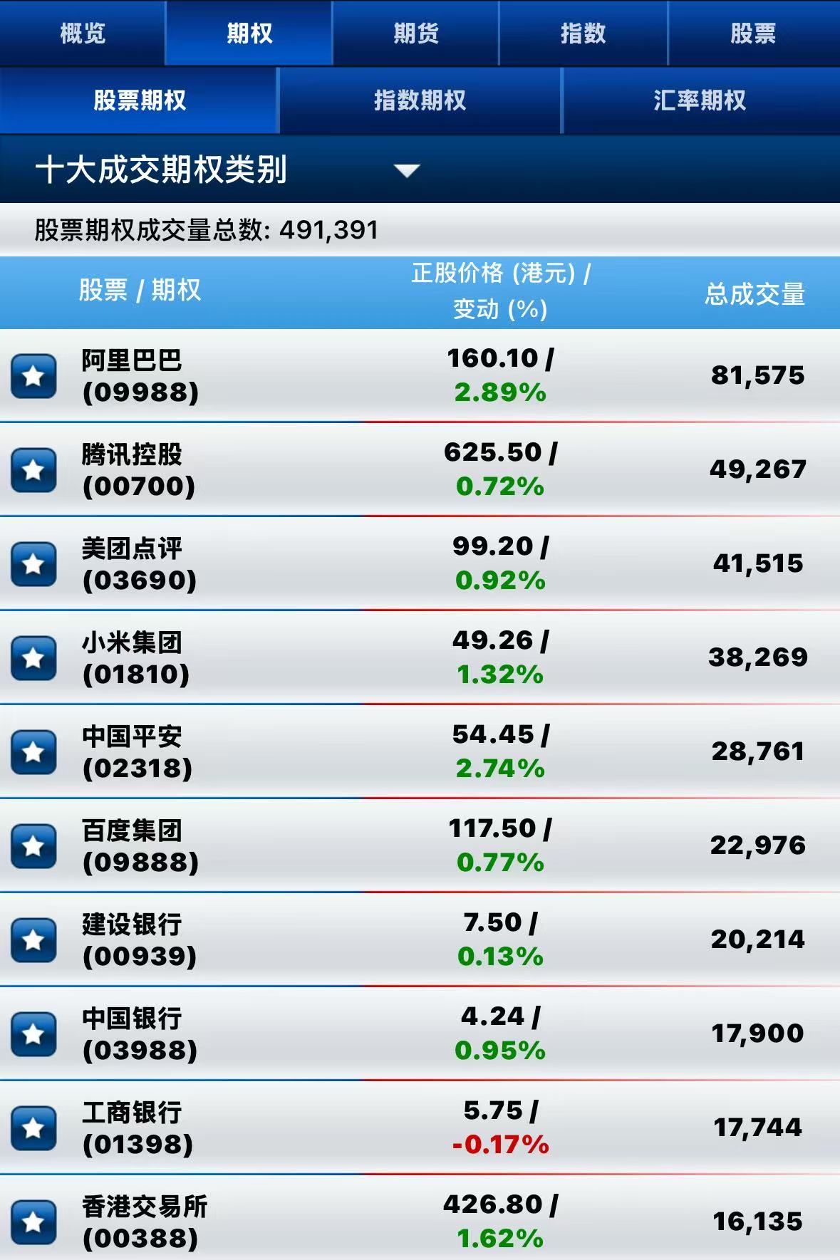 截止午间收盘,港股期权半日成交超49万张。其中,阿里巴巴-W成交量居前,期权成交超8.1万张;腾讯控股名列次席,期权成交超4.9万张;美团-W位居第三,期权成交超4.1万张。