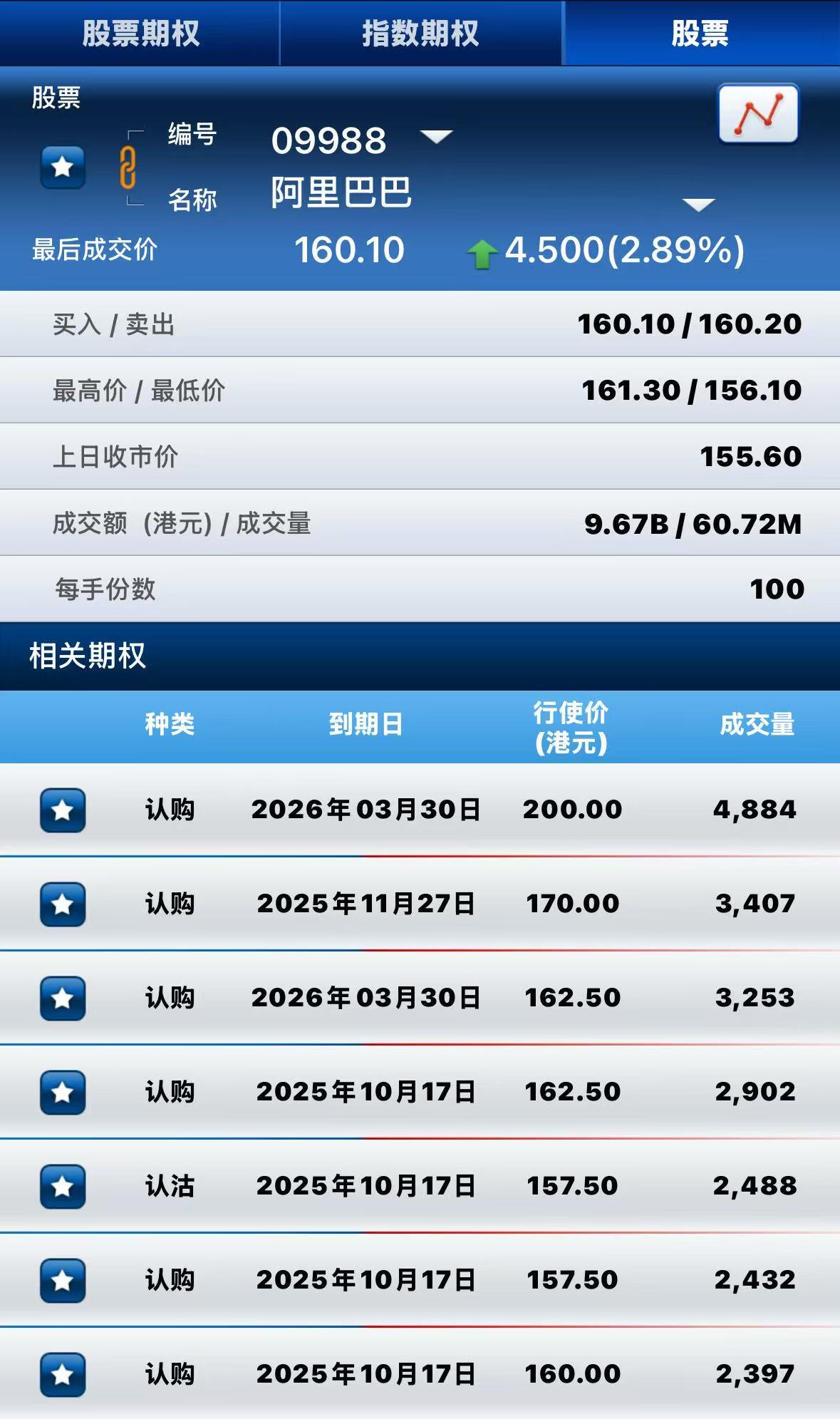 阿里巴巴-W涨近3%,期权方面:半日成交超8.1万张合约,其中于2026年3月30日到期行权价200港元的认购期权成交量居前,成交近4900张合约。 $ALB.HK 20260330 200.00 CALL$