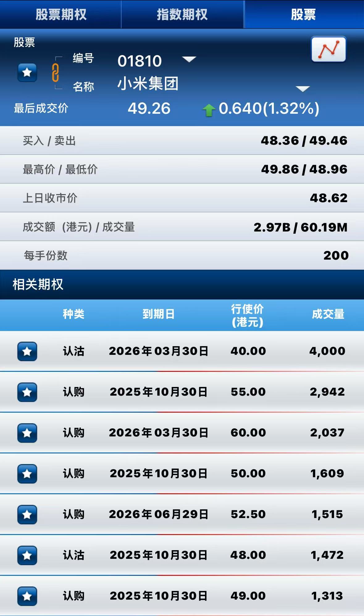 小米集团-W上涨1.32%,期权方面:半日成交超3.8万张合约,其中于2026年3月30日到期行权价40港元的认沽期权成交量居前,成交4000张合约。 $MIU.HK 20260330 40.00 PUT$