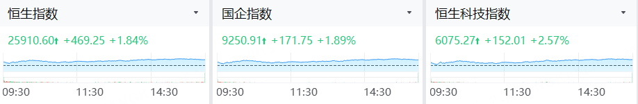 港股三大指数集体上涨,恒生科技指数涨2.57%重回6000点大关,恒生指数、国企指数分别上涨1.84%及1.89%。