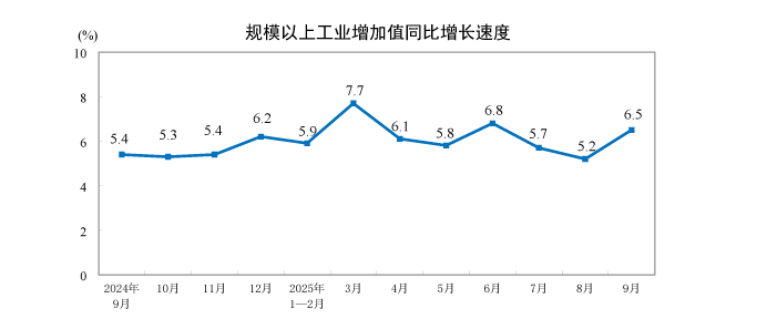 10月20日电,国家统计局数据显示,9月份,规模以上工业增加值同比实际增长6.5%。从环比看,9月份,规模以上工业增加值比上月增长0.64%。1—9月份,规模以上工业增加值同比增长6.2%。