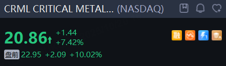 关键矿产概念股盘前全线上行,截至发稿, United States Antimony Corp 大涨11%,CRITICAL METALS CORPORATION 涨超10%,American Resources涨7.5%,USA Rare Earth、Energy Fuels涨超5%。