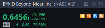 “人造肉第一股” Beyond Meat, Inc. 盘前一度飙升90%,截至发稿涨幅超76%。该股上周暴跌67.88%。