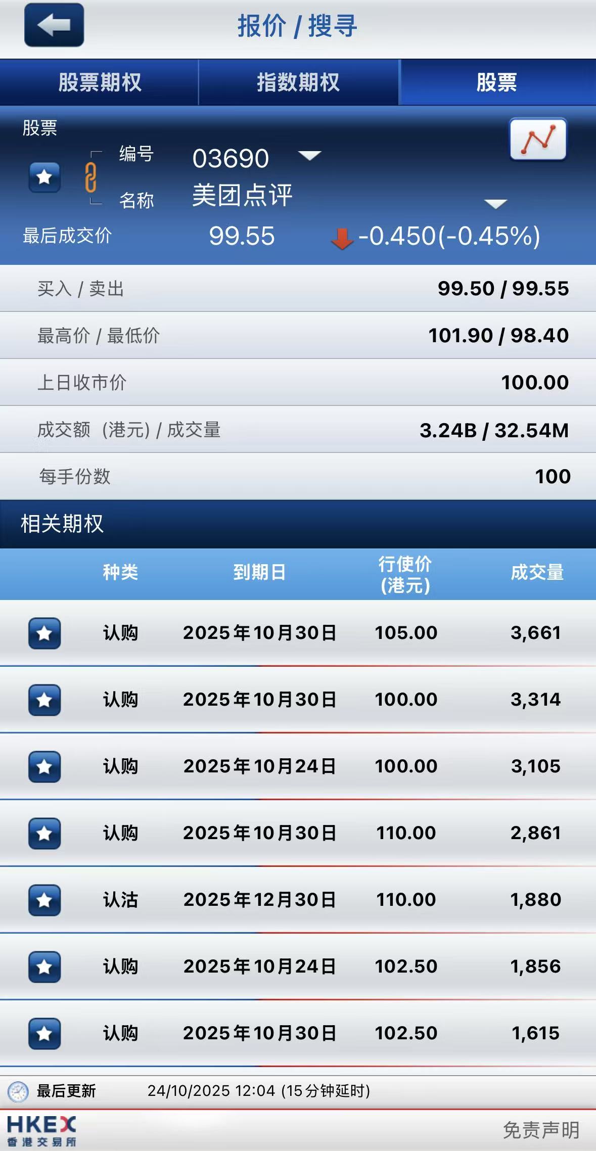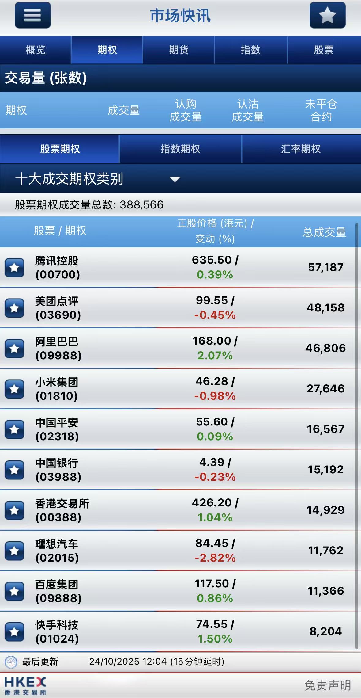截止午间收盘,港股期权半日成交超38万张,其中,腾讯控股成交量居首,期权成交5.72万张;美团-W名列次席,期权成交4.82万张;阿里巴巴-W位居第三,期权成交4.68万张。