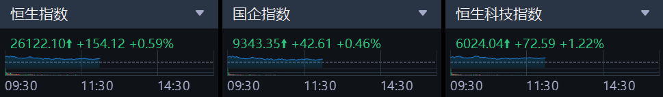 10月24日,港股上午盘三大指数集体上涨,恒生科技指数一度冲高至1.8%,午间最终收涨1.22%,恒生指数、国企指数分别上涨0.59%及0.46%,恒指重回26000点大关。
