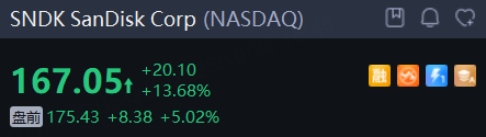 存储概念股盘前持续走强, SanDisk Corp 涨超5%,昨日创历史新高;西部数据涨超3%,希捷科技涨2.6%。