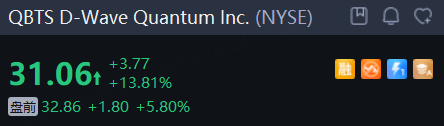 尽管美国政府否认了入股谈判,量子计算概念仍在盘前继续上涨。截至发稿,D-Wave Quantum Inc. 涨近6%, IONQ Inc. 涨3%,Rigetti Computing、 Quantum Computing Inc. 涨超2%。