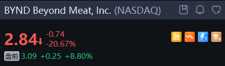Beyond Meat盘前涨超8%,股价隔夜大跌超20%。