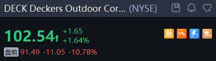 Deckers Outdoor盘前大跌超10%,公司预计2026财年销售额约为53.5亿美元,低于分析师普遍预期的54.5亿美元。