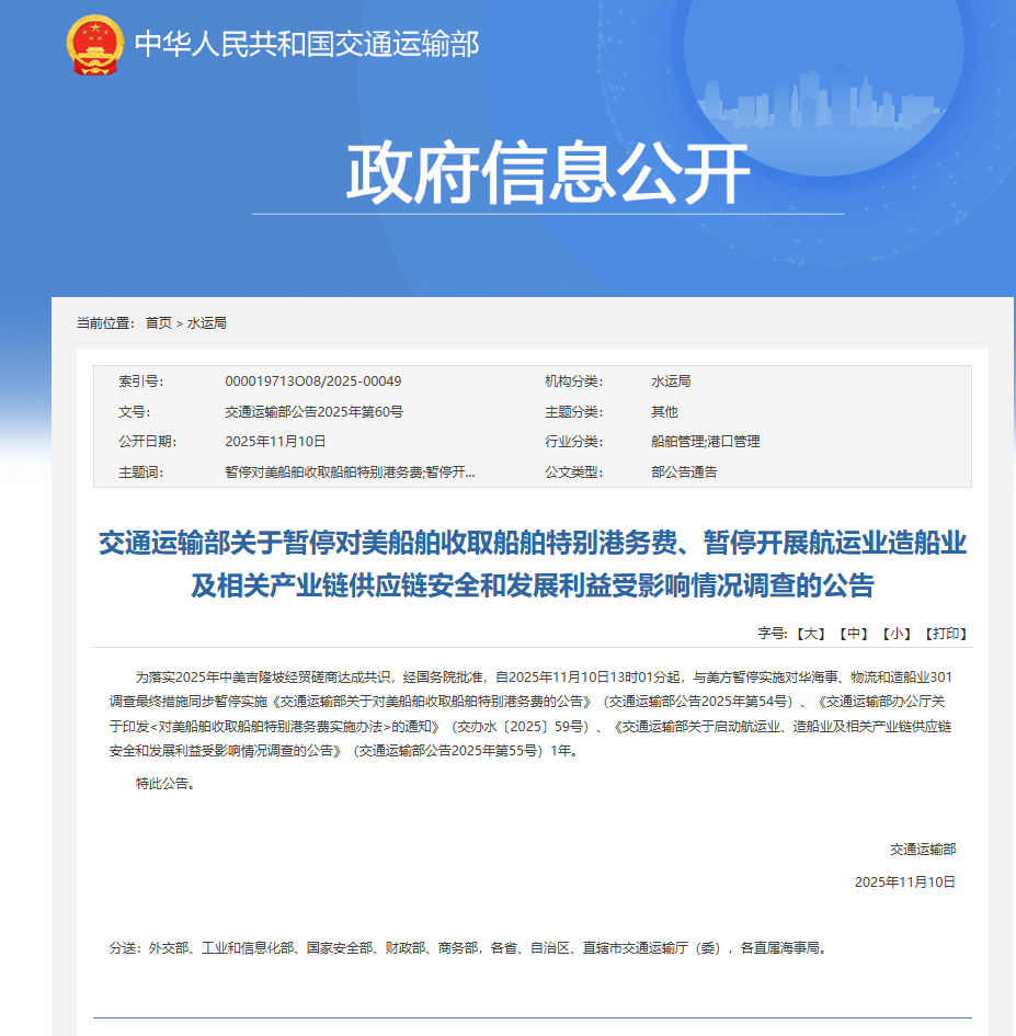 11月10日电,自2025年11月10日13时01分起,与美方暂停实施对华海事、物流和造船业301调查最终措施同步暂停实施《交通运输部关于对美船舶收取船舶特别港务费的公告》(交通运输部公告2025年第54号)、《交通运输部办公厅关于印发〈对美船舶收取船舶特别港务费实施办法〉的通知》(交办水〔2025〕59号)、《交通运输部关于启动航运业、造船业及相关产业链供应链安全和发展利益受影响情况调查的公告》(交通运输部公告2025年第55号)1年。