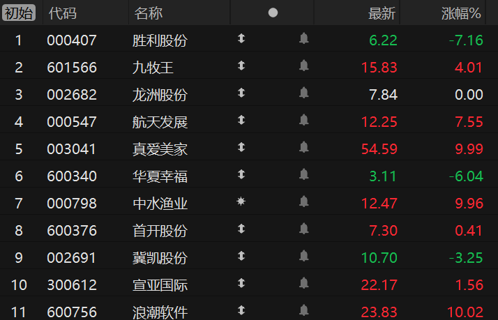 11月19日电,市场焦点股胜利股份(6板)低开7.16%,福建本地股九牧王(5板)高开4.01%、龙洲股份(4板)平开、航天发展(3板)高开7.55%,实控人变更的真爱美家(5板)竞价涨停,预重整的华夏幸福(4板)低开6.04%,水产股中水渔业(3板)竞价涨停,机器人概念股首开股份(5天3板)高开0.41%、冀凯股份(6天3板)低开3.25%,AI应用概念股宣亚国际(创业板2板)高开1.56%、浪潮软件(2板)竞价涨停。