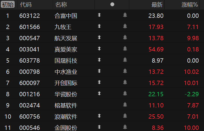 11月20日电,市场焦点股合富中国(14天12板)平开,福建本地股九牧王(6板)高开7.11%、航天发展(4板)竞价涨停,实控人变更的真爱美家(6板)高开0.18%,钙钛矿概念股国晟科技(8天6板)平开,水产股中水渔业(4板)竞价涨停、开创国际(3天2板)竞价涨停,陶瓷材料概念股华瓷股份(4板)低开2.29%,AI应用概念股榕基软件(3板)高开7.87%、浪潮软件(3板)高开7.01%,盐湖提锂概念股金圆股份(3板)竞价涨停。