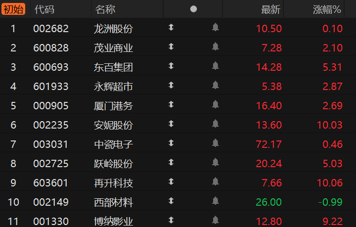 12月11日电,市场焦点股龙洲股份(6板)高开0.10%,零售板块茂业商业(12天7板)高开2.10%、东百集团(4板)高开5.31%、永辉超市(3板)高开2.87%,福建本地股厦门港务(4板)高开2.69%、安妮股份(5天4板)高开10.03%,光通信板块中瓷电子(3板)高开0.46%、跃岭股份(2板)高开5.03%,商业航天概念股再升科技(3板)高开10.06%、西部材料(4天3板)低开0.99%,影视股博纳影业(3板)高开9.22%。