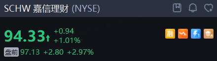嘉信理财涨近3%。三季度净新增资产总额达1344亿美元,同比飙升48%,高于分析师预期;当季净营收达61亿美元,较去年同期增长27%,高于市场预期;净利润为24亿美元,较2024年同期大幅增长67%,每股收益1.26美元,调整后每股收益1.31美元,均超过市场预期。