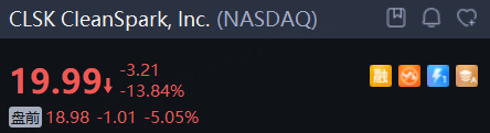 比特币回落,加密货币概念股盘前走弱, CleanSpark, Inc.、Bitfarms Ltd. 跌超5%,Coinbase、MARA跌近2%,MSTR跌0.5%。