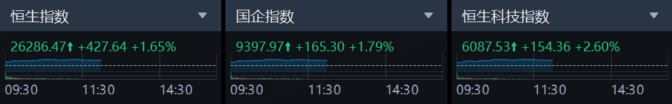 10月21日,港股上午盘三大指数继续昨日大反弹行情,恒生科技指数再度领衔,午间大幅上涨2.6%,恒生指数涨1.65%重上26000点大关,国企指数涨1.79%。