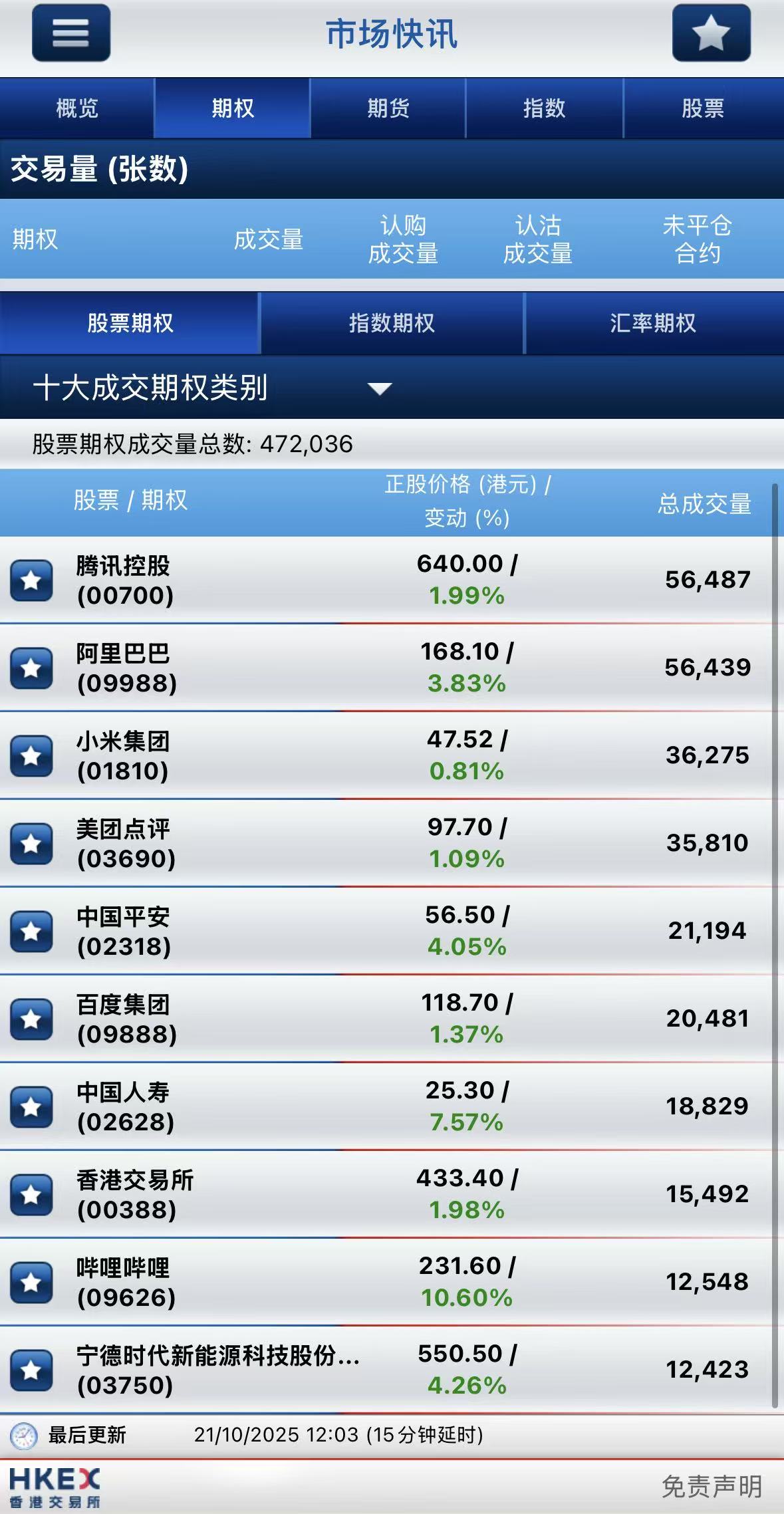 截止午间收盘,港股期权半日成交超47.2万张,其中,腾讯控股成交量居首,期权成交5.65万张;阿里巴巴-W名列次席,期权成交5.64万张;小米集团-W位居第三,期权成交3.63万张。