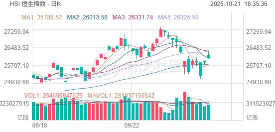 10月21日,港股三大指数午后涨幅稍有收窄,总体仍维持上涨格局,同时延续昨日反弹行情,市场情绪持续回暖。截止收盘,恒生指数涨0.65%重回26000点上方,国企指数涨0.76%,恒生科技指数涨1.26%报6007点。