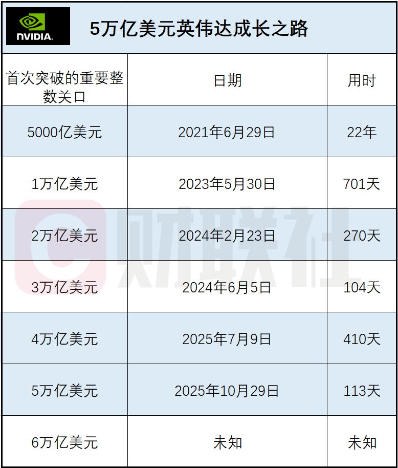 10月29日电,人工智能芯片制造商英伟达公司股价开盘上涨3.2%,市值站上5万亿美元,成为史上第一家市值跨越这一里程碑的上市公司,达到了惊人的5.05万亿美元。英伟达公司总市值从4万亿美元跨越5万亿美元,仅用时113天,而从3万亿到4万亿则耗时410天。高达5万亿美元的总市值,早已超过英、法、德等国家的股市总市值,这一数字正逼近印度股市总价值(5.3万亿美元)。这家总部位于加州圣克拉拉市的公司股价已较4月低点反弹超135%,市值也增加了2.9万亿美元,该公司股价今年已累计上涨54%。
