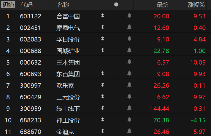 11月12日电,市场焦点股合富中国(11天10板)高开9.53%,电网设备板块摩恩电气(6板)高开0.40%,锂电池板块孚日股份(4板)高开4.84%、国城矿业(2板)低开1.00%,福建本地股三木集团(7天4板)竞价涨停、东百集团(5天3板)高开9.93%,大消费板块欢乐家(创业板2板)高开0.11%、三元股份(2板)竞价涨停,AI应用概念股线上线下(创业板2板)高开0.31%,存储芯片板块神工股份(科创板2板)低开4.15%,抗流感概念股金迪克(科创板2板)高开5.97%。